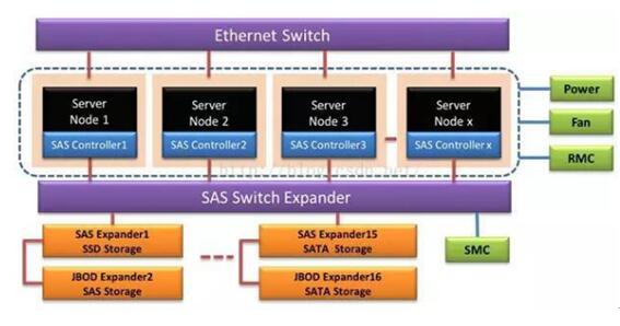 另外,SAS Switch还可以将同一个JBOD中的存储资源任意分解,根据业务应用的需要,灵活的进行计算和存储的配比,让硬件更完美的适应业务。