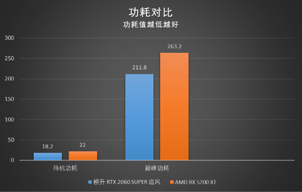 功耗则是通过Furmark烤卡10分钟后记录,经过10分钟的满载烤卡耕升 RTX 2060 SUPER 追风功耗方面待机情况下平均维持在18.2瓦上下,巅峰值最高到过211.8瓦。而RX 5700XT的功耗相比N卡要高,待机功耗平均维持在22瓦上下,巅峰值最高到过263.2瓦。