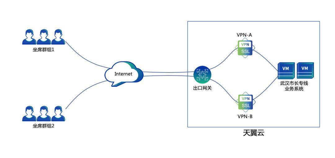 深信服通过天翼云平台向“武汉市长专线”提供了两套vSSL ***服务授权。为确保平台稳定可靠运行,将坐席人员的账号分为两个群组,正常情况下,两组坐席人员分别通过两套vSSL ***登录“武汉市长专线”平台。假如其中一套vSSL ***出现故障,可由另一台正常工作的vSSL ***同时为两个群组提供服务。