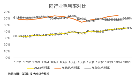 最后,在盈利能力上,AMD毛利率达到了45.8%,同比增长5个百分点,虽然仍低于竞争对手英特尔和英伟达,但不得不说,AMD的势头很猛。