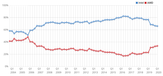 优秀的产品为AMD赢得了更大的市场份额,根据passmark的统计,2020年2季度,AMD的CPU市场份额达到33.8%,正在不断缩小和英特尔的差距。