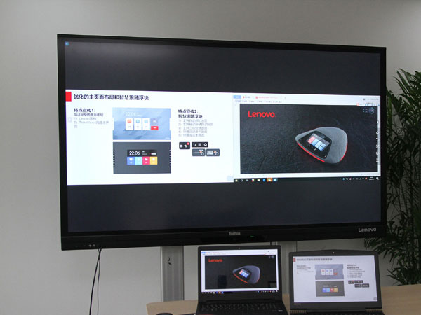 同时,联想BM系列旗舰版会议平板在多个无线传屏连接时,还可以自由单点轮流切换画?;同时支持分屏功能,支持多达4台设备(手机、电脑、平板)画面同时显示。这对系统的带宽和信号处理冗余提出了更高的挑战,也实现了更好的“信息交互”共享体验。