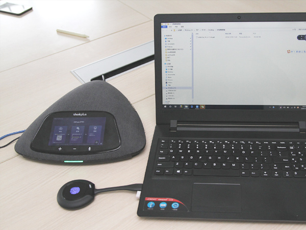 其中,专业无线传屏器的应用非常简单,实现完全傻瓜化的自动配对,可以在非联网设备之间实现智慧大屏传屏显示,同时专有协议也可以保障内容的“无线信号”安全性。无线投屏器也可以与thinkplus智能会议一体机联合应用。