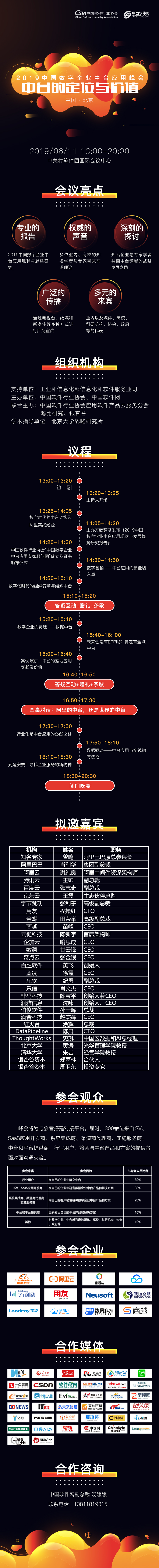 2019年6月11日,由中国软件网主办的首个中国数字企业中台应用峰会将在北京中关村软件园国际会议中心召开。作为该领域首个大会,五大亮点将引爆行业热点。大会主题为“中台的定位与价值”,行业权威专家、学者、中台提供商、用户及合作伙伴300余人参加,旨在“洞察产业趋势,达成行业共识,搭建合作平台”。