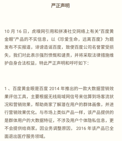 百度官方声明中对该产品的说法和对虎嗅网报道的谴责