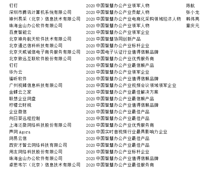 附:2020中国智慧办公产业生态大会推优名单(排名不分先后)