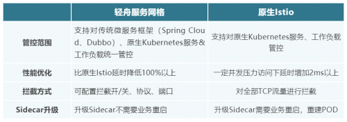性能优化:针对数据面引入Sidecar导致延时增加的问题,轻舟服务网格自研网络加速组件,持续优化数据面,相比开源方案服务延时降低100%以上;