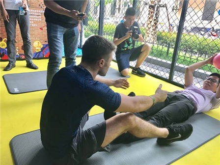 火爆的开场活动之后,主持人宣布上海站线下主题推广活动正式开始,现场的观众纷纷开始挑战项目。活动现场设有双人起卧球、老铁转转乐、默契双人跳、炫酷自行车、摸高二人组、海信手机拍拍拍等挑战项目。我们的KOL更是与挑战者们组成CP,带领观众玩转健身小游戏。