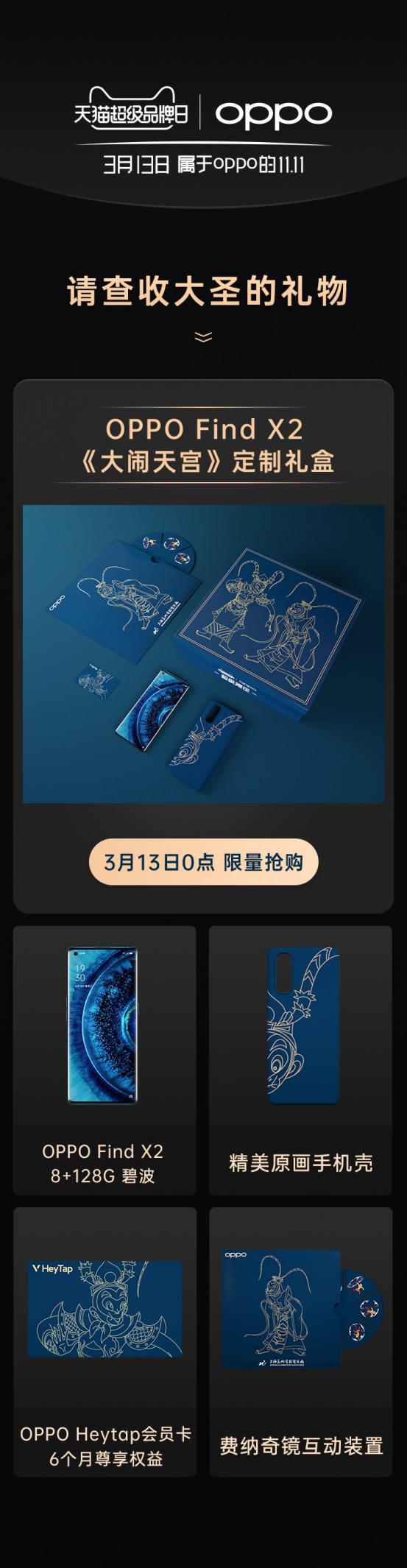 另外OPPO还与天猫超级品牌日有着深度合作。在3月13日天猫超级品牌日活动期间,用户购买OPPO Find X2标准版(8+128GB碧波版)产品,不仅可享受24期免息分期等权益,OPPO还联合天猫为消费者精心准备了《大闹天宫》限量礼盒,内含大闹天宫原画手机壳及OPPO Heytap会员等精美周边。