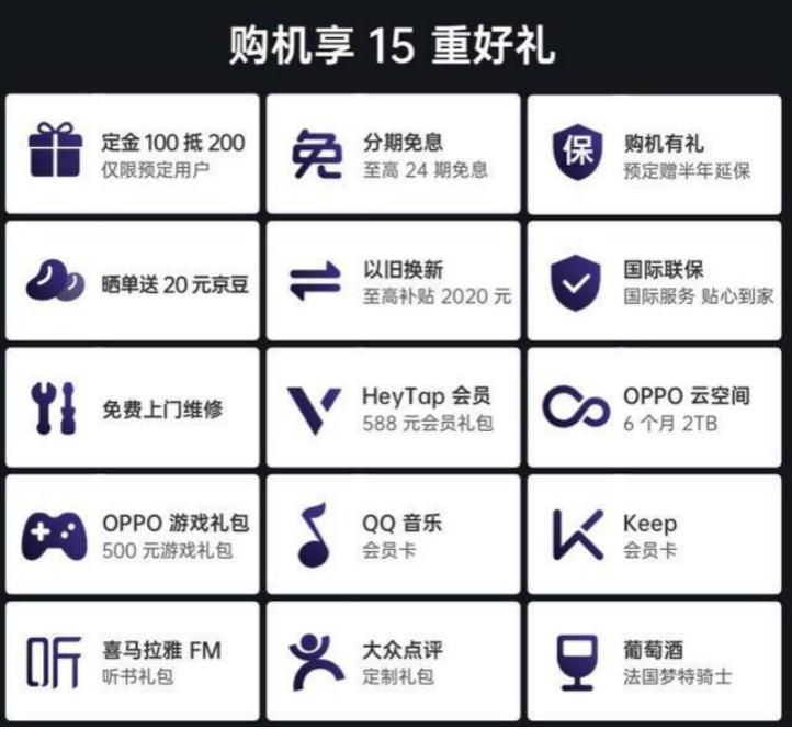 天猫超品日还拥有“购机享15重好礼”活动,包括定金100抵200、以旧换新至高补贴2020元等福利,而丰富多样的互联网大礼包,其中包括价值588元的HeyTap大会员月卡、6个月2TB云空间以及OPPO游戏畅玩礼包等与产品体验密切相关的服务权益。