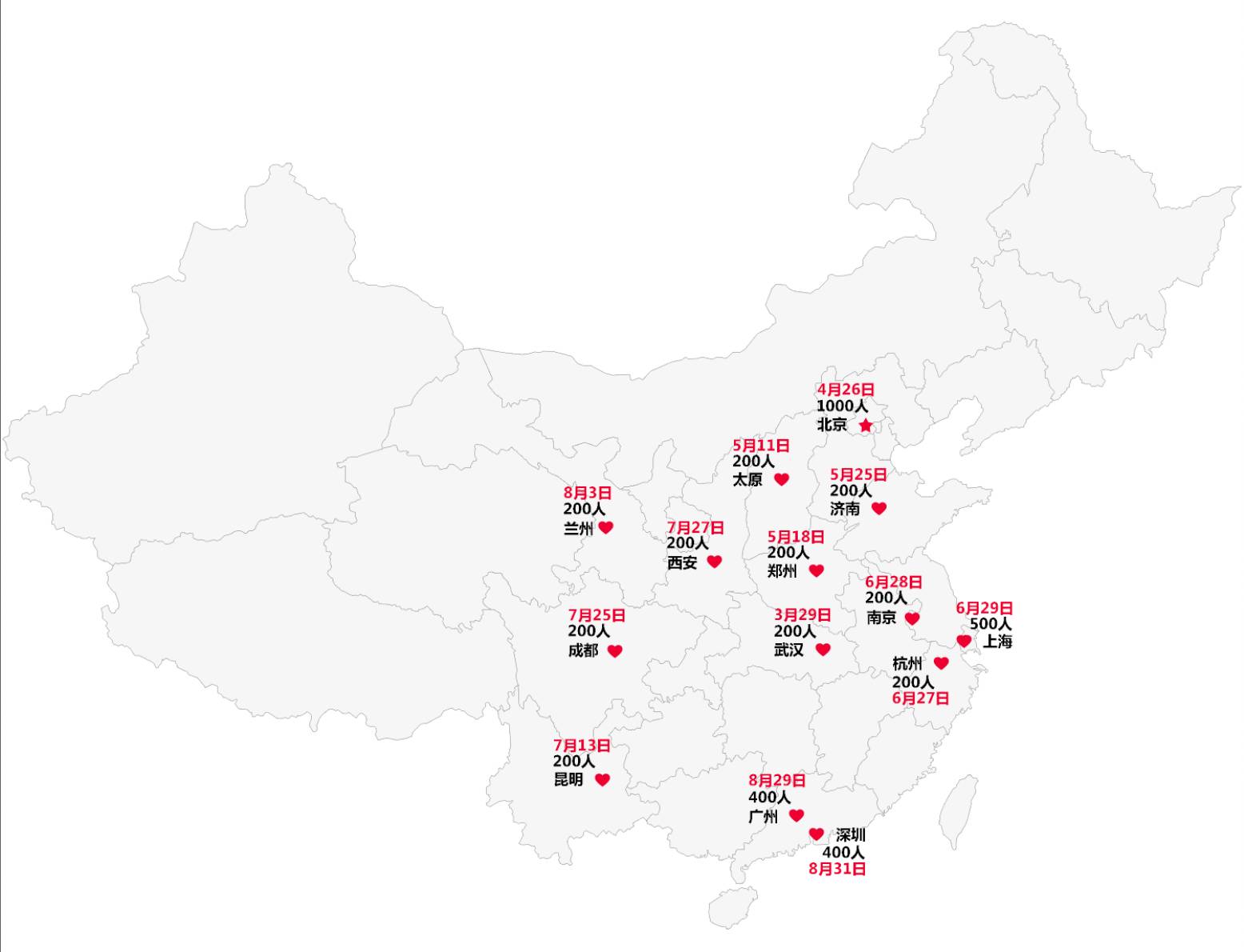 武汉(3.29)、北京站(4.26)、太原(5.11)、郑州(5.18)、济南(5.25)、杭州(6.27)、南京(6.28)、上海(6.29)、昆明(7.13)、成都(7.25)、西安(7.27)、兰州(8.3)、广州(8.29)、深圳(8.31)