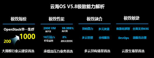 云海OS 5.8为此已经做好了准备,通过组件、内核等优化,将单一集群能力提升至1000节点,位列全球TOP5,成为大规模行业云建设首选。在提升部署效率方面,云海OS 5.8支持容器化部署,提供Devops、微服务治理等能力,全面支持云原生应用,为行业合作伙伴软件敏捷开发、用户业务快速上线提供坚实支撑。