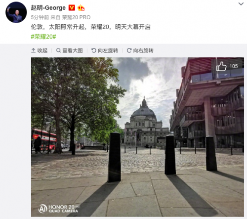 在网友纷纷表示对华为和荣耀支持的同时,荣耀总裁赵明也发布微博:“伦敦,太阳照常升起,荣耀20,明天大幕开启”,荣耀20系列新品全球发布会一切准备就绪。