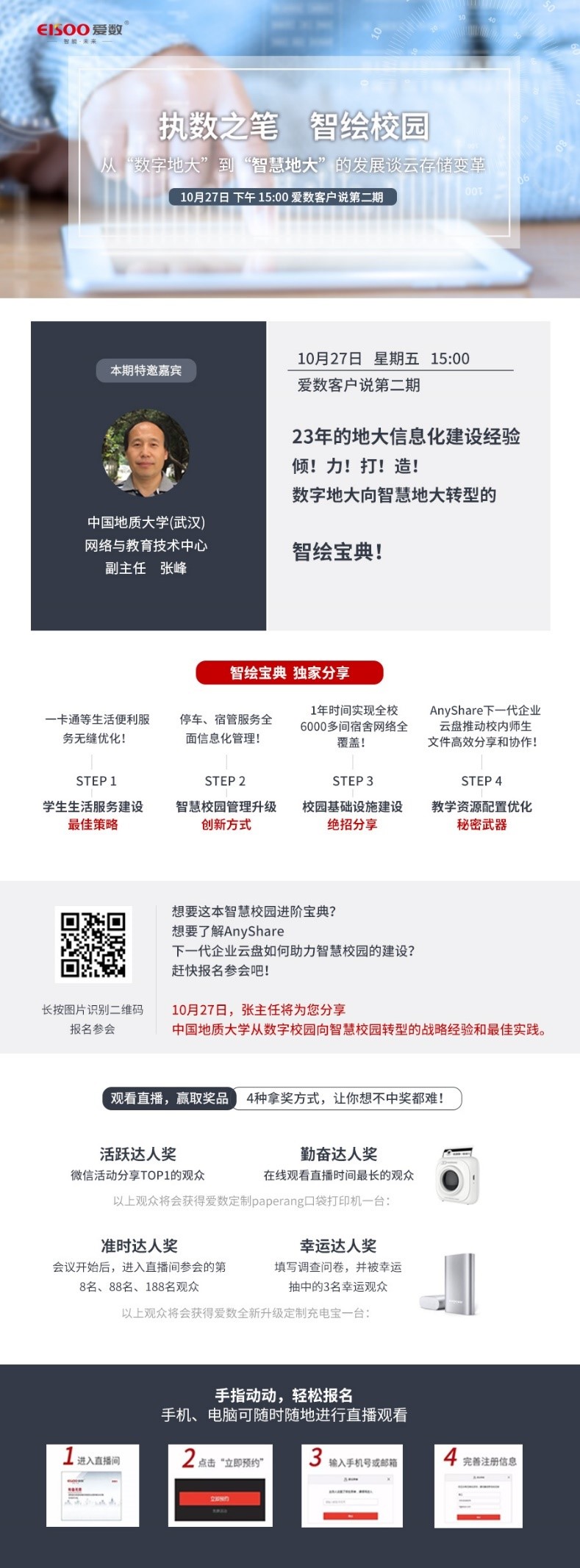 为了更好的让大家了解走在智慧校园建设最前端的高校是如何进行信息化建设、向智慧校园转型的,这一期爱数直播间荣幸的邀请到了中国地质大学(武汉)网络与教育技术中心副主任 - 张峰,从数字地大向智慧地大的发展,谈高校云存储的变革,分享地大23年的信息化建设历程和经验,剖析未来智能校园的演变趋势。