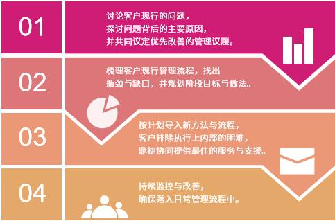 从蓝图规划开始,展开关键议题的方案设立与指标建立,到蓝图实施的作业设计,展开效益实现,最终是关键议题效益逐步实践,从规划到看见进而发挥,目标也必须在项目进行过程中不断被精准校正,确保目标达成,同时设定阶段里程碑与企业共同检视阶段达成进度。