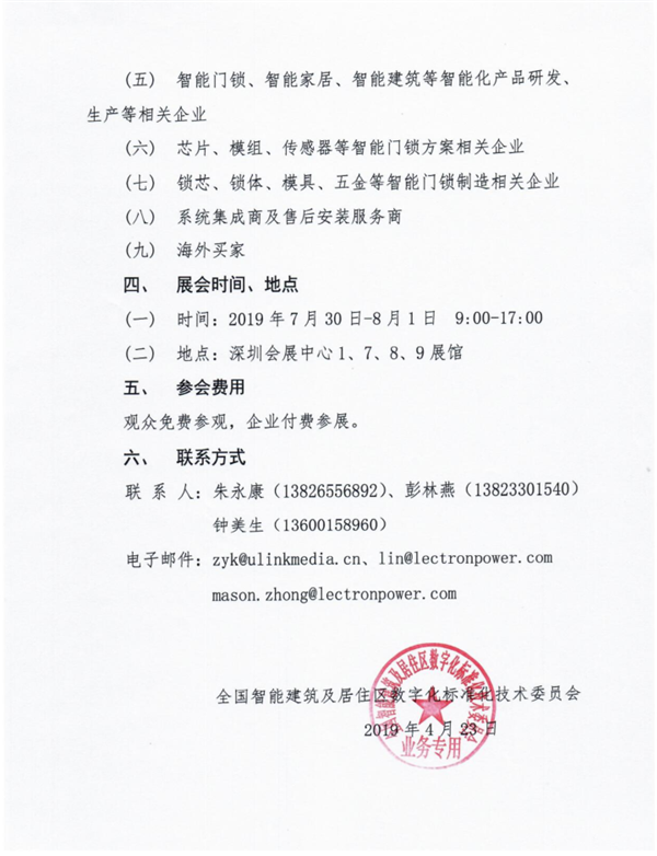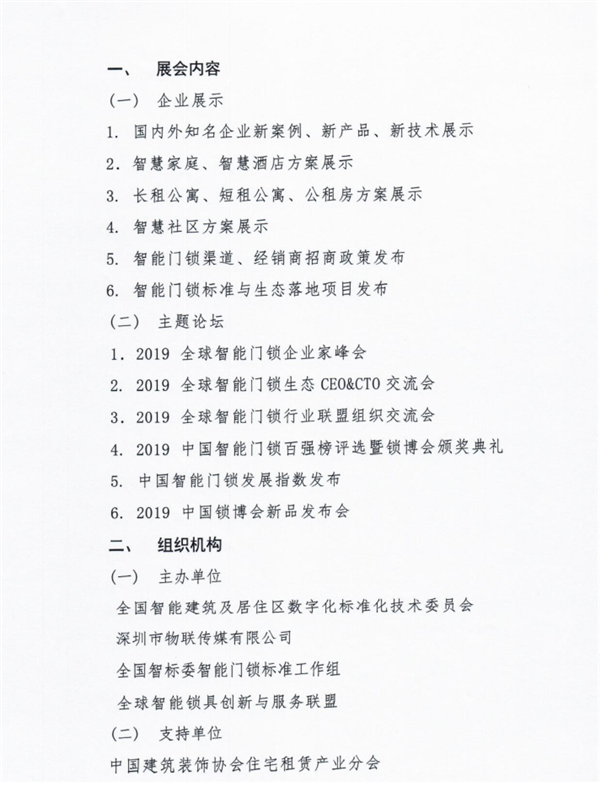 近日,全国智能建筑及居住区数字化标准化技术委员会发出《关于召开“2019中国国际智能门锁博览会”的通知》。文件内容如下: