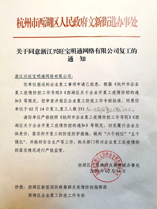 在取得杭州市西湖区人民政府文新街道办事处《关于同意浙江兴旺宝明通网络有限公司复工的通知》后,公司进行了大量防护准备工作,并于 2月24日正式复工。