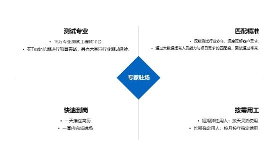 这时候如果能有这么一种服务,它为你提供经验丰富的测试工程师驻场测试,发布项目需求后,一天内就能根据项目实际需求匹配到最适宜的测试工程师,一周内工程师到客户场地开展测试服务。企业不必再为找人养人而花费巨额时间和金钱成本。基于以上企业对项目测试需求的痛点,Testin云测在基于自主知识产权的AI自动化工具平台,以及数百万成员的规模化云众包平台,基础上又于2018年推出了专家驻场服务。