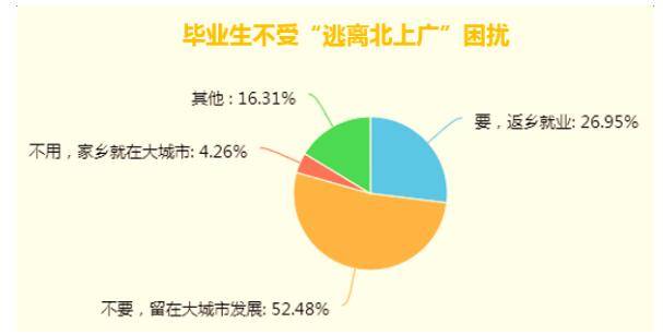 毕业返乡问题同样受到学生关注。对于家在小城镇的大学毕业生而言,是个难以抉择的问题。在大城市打拼,可以有更多发展空间和向上的机会,而返乡后,工作和成长的压力更小,活得也会更为舒适。调查发现,过半数的毕业生选择留在大城市发展,大城市会将会面临更激烈的就业竞争,而小城市却面临着人才流失的问题。
