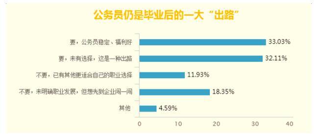 多数毕业生看重公务员的稳定性及待遇,更认为在“毕业即失业”的当下,公务员未尝不是一种出路。与传统观点上女生更偏向于考公务员不同,有相当一部分女生认为,即便尚未清楚日后的职业发展规划,也不要考公务员。