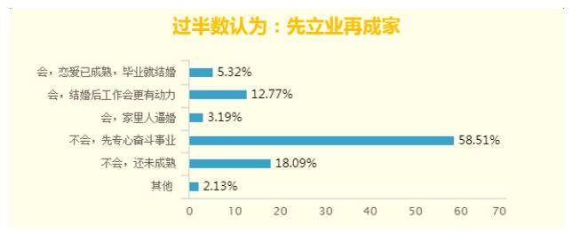 相较于谈恋爱,结婚则标志人生进入另一个里程碑,近8成的毕业生都认为,毕业后需要先奋斗事业、自己还不够成熟,未到时机结婚。