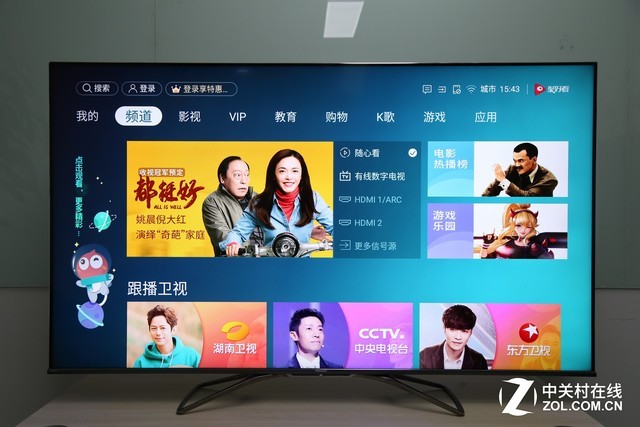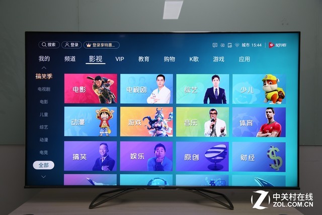 主界面较以往做出了很大的优化,影视、教育、购物、游戏、应用等多个主页模块采用横向悬浮式设计,而每个模块又能单独下拉进行内容选择,从逻辑上看减少了层级间的跳跃,没有任何操作难度。