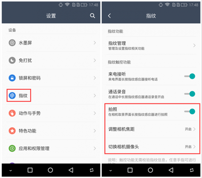 让人惊喜的是,海信还将指纹识别与拍照进行了融合,带来了很多创新性玩法。进入手机拍照界面,用户可以通过长按指纹的方式实现手机拍照,也可以通过上下滑动指纹的方式进行前后置摄像头之间的切换,还可以通过前后滑动指纹的方式来调节相机焦距的大小,极大的方便了手机拍照单手操控。