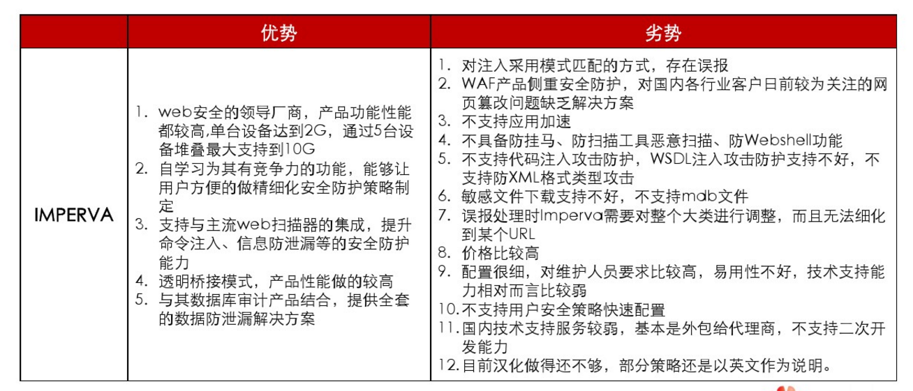 2014年5月网上流传的一份《华为WAF安全网关产品售前专家培训》,以同行的角度明确的指出了Imperva WAF产品多达11项劣势。每一条都精准的把握了Impreva WAF产品对中国用户而言不得不担忧的顾虑。