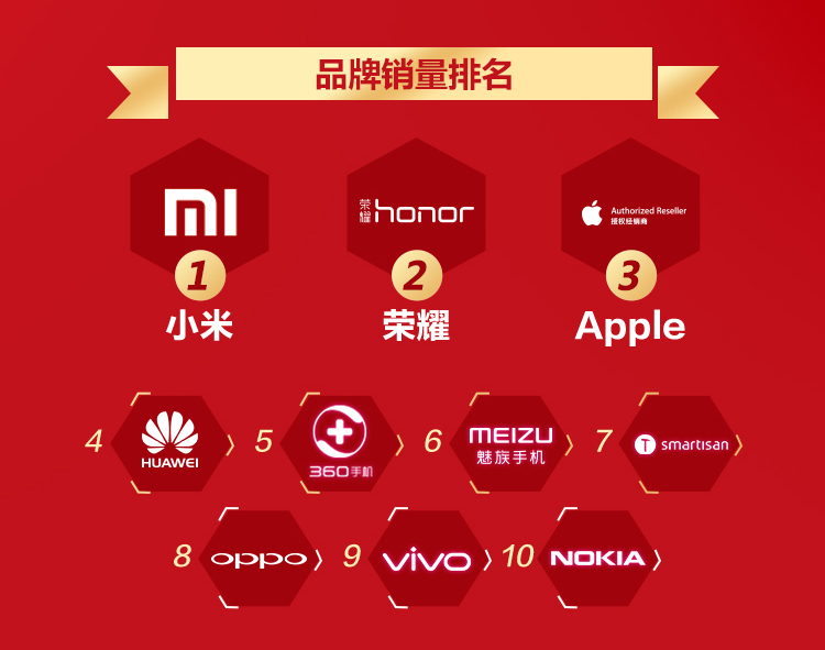 在手机累计销量品牌TOP 10榜单上,中国品牌小米位居榜首,荣耀、Apple和华为紧随其后,此外,360、魅族、锤子、OPPO等均榜上有名。