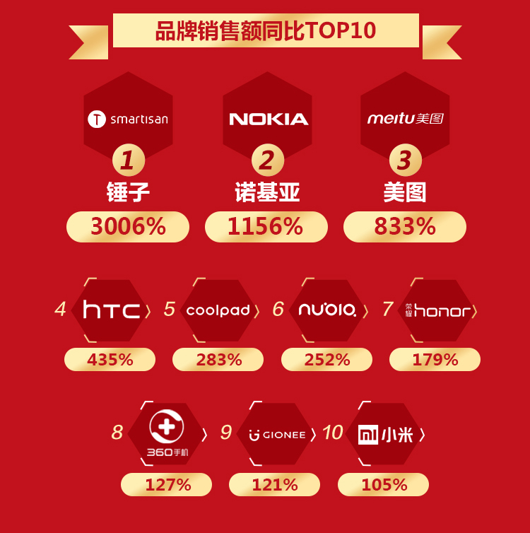 在销售额同比增长TOP10榜单上,锤子以销售额同比增长3006%独占鳌头;老牌劲旅诺基亚位居第二,同比增长1156%;锤子、美图、酷派、努比亚、荣耀、360、诺基亚、小米八家互联网品牌均榜上有名,呈霸榜趋势。