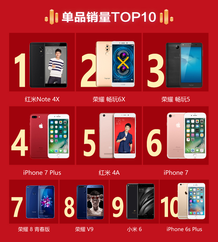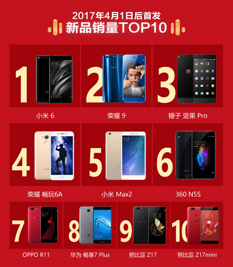 根据首发单品销量TOP10榜单,互联网手机品牌小米、荣耀继续霸榜,各在前五位中占据两席,小米6更成为新品销量第一,锤子旗下的坚果Pro作为最大的黑马突围抢得第三席。