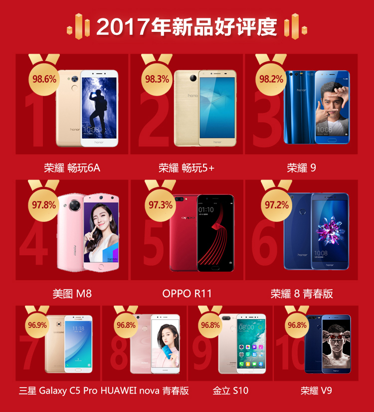 在好评度最高单品排行榜上,荣耀成为最大赢家,旗下机型占据榜单的半壁江山,而美图M8,OPPO R11等主打年轻群体的机型均榜上有名;纵观整个好评榜,中国手机好评度稳步提升,品牌力得到消费者进一步认可。