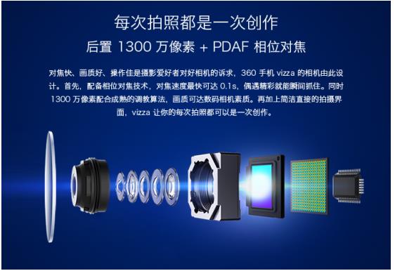 据了解,为满足需求热点,360手机vizza除在同价位机型中,罕见地搭载了4GB超大运存和1080P全高清屏幕外,还提供了前置800万+后置1300万像素摄像头组合,其中后置摄像头不仅采用了F/2.0大光圈镜头,进光量充足,可确保即使在阴暗环境下也能轻松拍出一张效果亮丽的照片,而且支持PDAF相位对焦,快至0.1的对焦速度,可确保用户在打开相机的一瞬,即可精准成像。