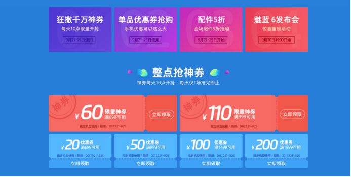 除了以上两代旗舰手机的优惠外,魅族更是为魅友节精心准备了多重惊喜,从明天开始,前期预热时领取的各项优惠券及神券便可正式投入使用,有囤券的魅友购机可直接享受直减的优惠。如果之前没领券的话,也不要懊恼,小编亲测,目前该页面也还是可以领取的。在用券直减的同时,魅族还为魅友准备了部分配件五折起的空前优惠力度,更有爆款手机秒杀价等你来秒。
