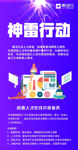 同步推出“在线人才共享计划”,对供应商闲置资源进行刻画,面向不同客户用人场景推出短期驻场、人力外包、团队外包、远程外包服务,通过线上连接方式为客户推荐快速人才对接服务,解决企业用工难、服务商人才资源复工难的问题。