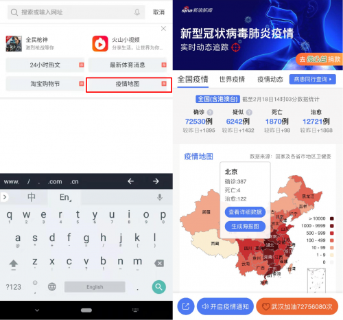 除在视频类客户端获取疫情信息外,基于用户搜索行为与资讯兴趣,微米浏览器在热门关键词醒目位置上线“疫情地图”入口,方便用户在搜索过程中第一时间注意疫情动态。这里包含了全国疫情数据统计、各省市疫情地图,以及病患同行查询、小区疫情查询等疫情实时动态查询服务,帮助用户做好疫情预防。