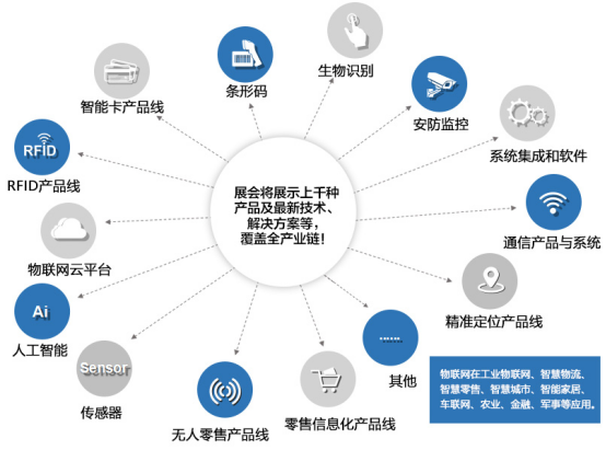 2)完整产业链:IOTE是中国物联网产业链最完整的展示,涵盖物联网感知层(MEMS、RFID、智能卡、传感器、条码、生物识别、视频监控),网络传输层(NB-IoT、LoRa、2G/3G/4G/5G、eSIM、ZigBee、Bluetooth、GPRS、WIFI、UWB、Z-wave),运算与平台层(云计算、边缘计算、云平台、大数据与数据安全、人工智能),以及应用层(智慧城市、智能家居、实时精准定位、智慧零售、无人售货、工业4.0、智慧物流、政务科技)。