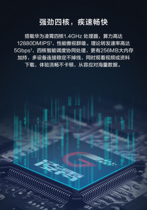 华为凌霄四核1.4GHz 处理器作为华为自主研发的高性能CPU,算力高达12880DMIPS,其理论转发速率高达 5Gbps,四核智能调度协同处理,在256MB大内存加持下可以有效降低负载,提升多任务性能。在多设备同时连接的情况下,稳定不掉线,流畅不卡顿,从容应对任何挑战,轻松跑满1000M以内光纤宽带。