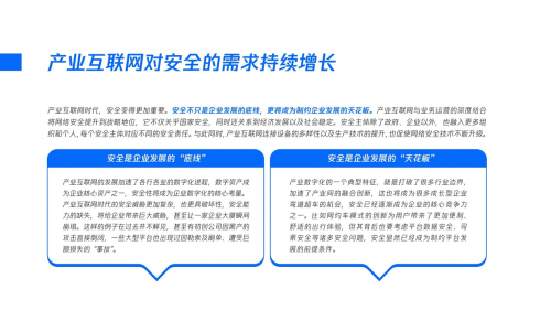随着各行各业的数字化程度不断加深,产业互联网的安全威胁更加隐蔽、复杂、更具破坏性。相比消费互联网,产业互联网的安全呈现出新的特性。产业安全已成为企业的生命线,关乎企业生存。一旦企业的用户数据被黑客窃取,不仅是股价、利润会受到巨大影响,也会引发巨大的用户信任危机,给企业带来持续损害;同时,产业安全还关乎企业发展,数字化贯穿企业研发、生产、流通、服务等全过程,无不涉及安全需求,安全已经逐渐成为企业的核心竞争力之一。例如网约车模式的创新为用户带来了更加便利、舒适的出行体验,但其背后也要考虑平台数据安全、司乘安全等诸多安全问题,安全显然已成为制约平台发展的前提条件。可以说产业安全不仅是企业发展的“底线”,更将成为制约企业发展的“天花板”。