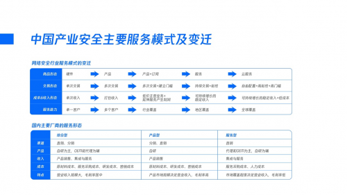 报告还分析了目前产业安全行业服务模式的变迁过程。伴随着云计算以及其他智能化技术的引入,产业安全的商品形态经历了“硬件—产品—产品+订阅—服务—云服务的变迁历程,同时交易形态也从传统的单次交易进化为以“自由配置+高粘性+高门槛”为主要特点。