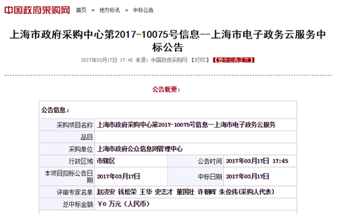 2017年3月20日,中国政府采购网发布的《上海市证书采购中心第2017-10075号信息-上海电子政务云服务中标公告》中显示,中标供应商名称为中国移动通信集团上海有限公司+云赛智联股份有限公司,中标金额为0元。