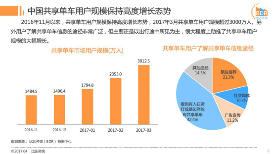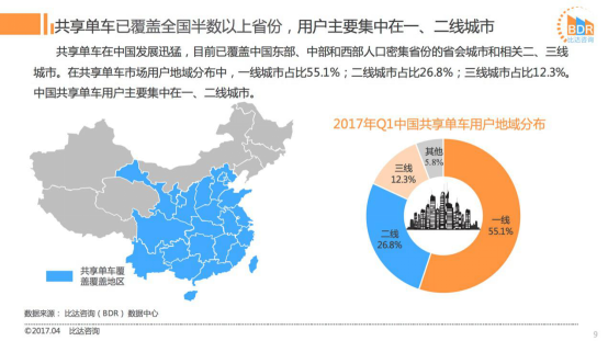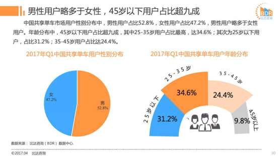 国内知名数据调研机构比达咨询(BDR)最新发布的《2017年Q1中国共享单车市场研究报告》显示,自2016年12月以来,共享单车用户规模保持高度增长态势,3月整体用户规模已超3000万人,核心用户主要集中在一二线城市,占比近82%。如今共享单车行业已有25家以上品牌入局,ofo、摩拜优势较为突出。