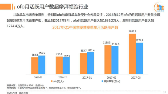 2017Q1共享单车市场:ofo市占率近52%超摩拜12% 活跃用户数超摩拜362万