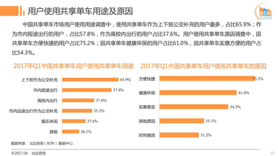 中国共享单车市场用户使用用途调查显示,上下班作为公交补充的用户最多,占比65.9%;市内短途出行的用户,占比57.8%。用户使用共享单车原因调查中,因共享单车方便快捷使用的用户占比75.2%;因共享单车健康环保使用的用户占比61.0%。
