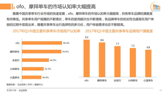2017年Q1共享单车市场,ofo用户市场认知率为96.4%,摩拜用户认知率为94.6%。另外在用户满意度方面,ofo以9.3分位居行业第一成用户最满意平台,摩拜以8.6分位居第二。