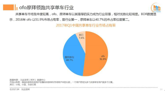 另据比达咨询《2017年Q1中国共享单车市场研究报告》显示,ofo小黄车2017年第一季度以51.9%的市场占有率居于行业第一,远超摩拜近12%,同时ofo在单车投放量、覆盖城市数等主要指标方面均领先对手。