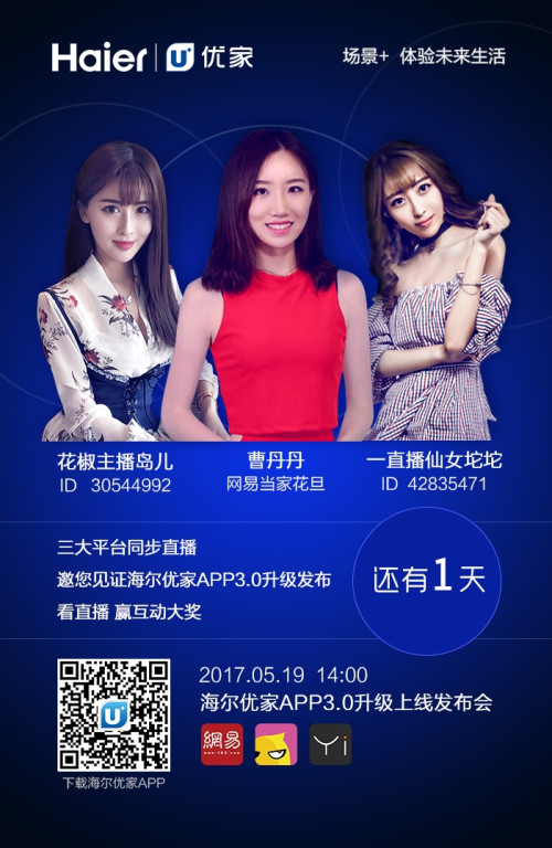 海尔优家app3.0升级上线,5月19日下午两点,网易、花椒、一直播三大平台同步直播,带给你不一样的智慧生活体验!网易客户端用户点击{直播}菜单,即可点击海尔优家APP 上线发布会的精彩直播。花椒、一直播用户搜索知名美女 主播ID即可观看。