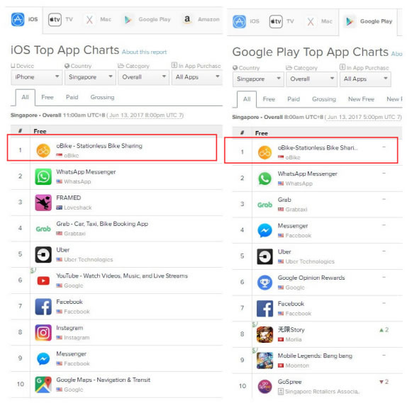 oBike位列IOS和Google Play新加坡全类别下载榜第一