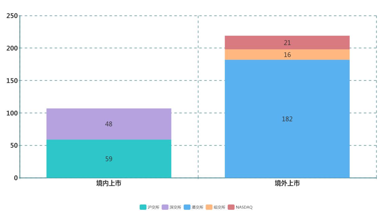 从上市地点选择来看,2018年有107家选择了境内上市,219家选择了境外上市,香港交易所、美国的纽约证券交易所和纳斯达克证券交易所,成为国内企业赴境外上市首选的三个地点。