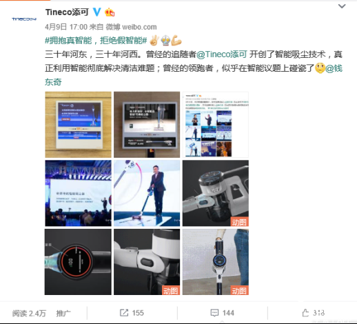 无独有偶,就在戴森还没来得及就此事发表评论的时候,添可却率先官宣了。以下是添可官方的回应内容:“三十年河东,三十年河西。曾经的追随者开创了智能吸尘技术,真正利用智能解决清洁难题;曾经的领跑者,似乎在智能议题上碰瓷。”